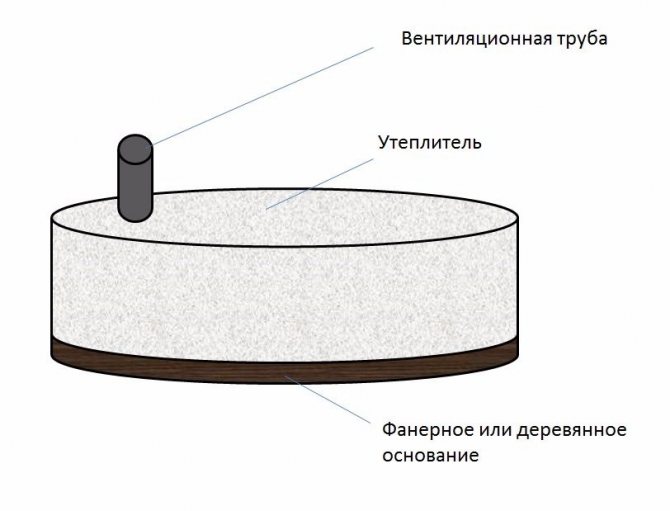 Стъпка втора. Продължаваме да затопляме кладенеца за зимата. Изрежете трети кръг със същия диаметър, но този път от пяната. Залепете го в долния кръг с помощта на качествено лепило за дърво и фиксирайте третия кръг отгоре. След като лепилото изсъхне, поставете вентилационна тръба в подготвения отвор. Можете да използвате полиуретанова пяна като уплътнение за фуги.