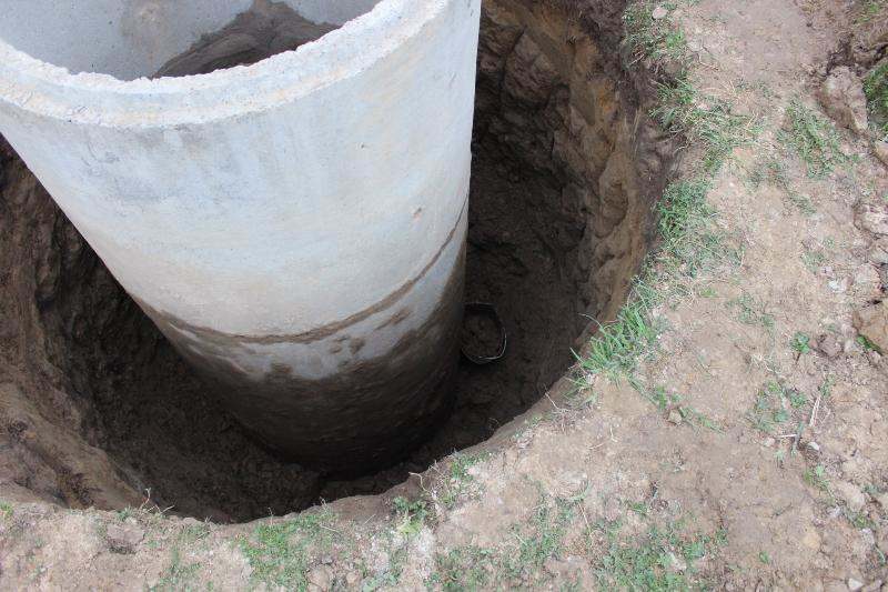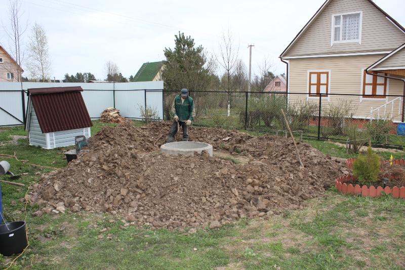 - Стенният пръстен трябва да бъде изкопан на двадесет сантиметра - до дълбочината на замръзване на почвата. Като цяло ще трябва да влезете дълбоко около 1,2 метра. Тъй като това не е много удобно за правене, ще трябва да изкопаете доста голяма яма. Ако броите пръстените отгоре, тогава е достатъчно да направите с дълбочина 20 см под кръстовището на първите 2 пръстена.