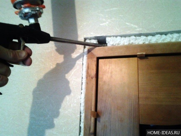 - Пукнатините между отвора и кутията също се издухват с пяна.