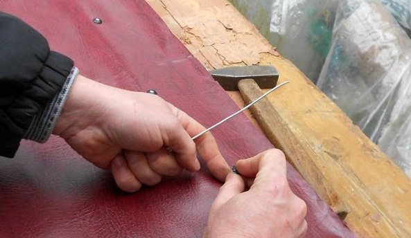 Най-добре е да прикрепите дермантин към специални нокти. Те имат голяма декоративна капачка, която придава на ножницата по-привлекателен вид. Можете също така да прекарате медна тел върху ноктите. Ако го издърпате, получавате допълнителна стойка както за изолация, така и за външна декорация.