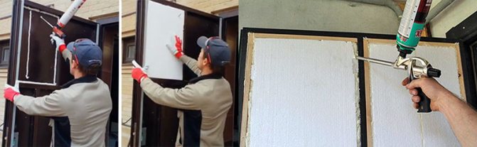 - След това всеки сектор е покрит с лепило, така че изолацията, избрана за изолацията на вратата, да се придържа по-добре. Лепилото се нанася на ленти или на непрекъснат тънък слой.