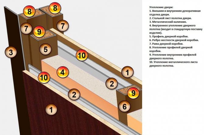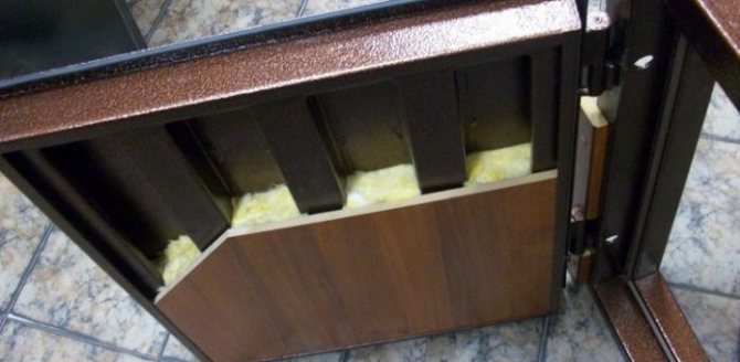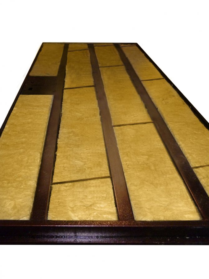 Когато се използва минерална вата, трябва да се монтира слой хидроизолационен полимерен филм. Най-добре се използва за изолиране на метална врата, която влиза във вход, преддверие, където няма голяма температурна разлика и няма риск от конденз.