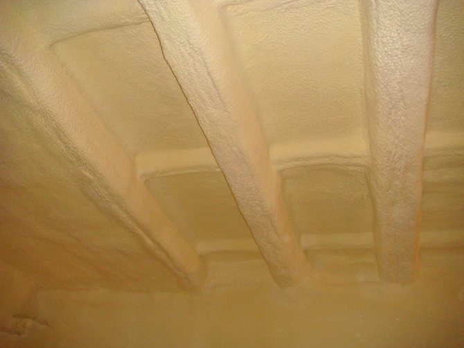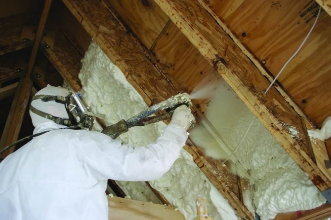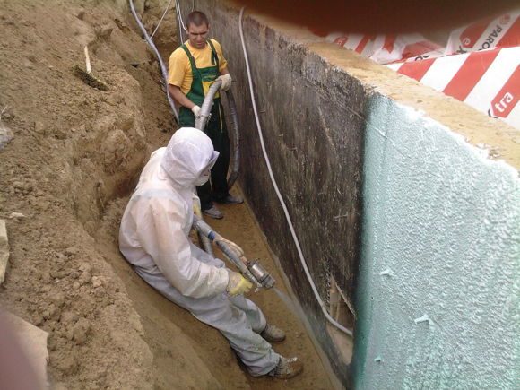 полиуретанова пяна... Това е материал, пръскан върху повърхност, която трябва да бъде изолирана. Важна характеристика на полиуретановата пяна или накратко полиуретановата пяна е способността му да запълва недостъпни места. Полиуретановата пяна, подобно на екструдирания полистирол, е устойчива на поглъщане на огън и влага, върху нея също не се образува гъбичка, методът на приложение ви позволява да направите най-плътната връзка между повърхността и изолацията.Силен слой топлоизолация се получава при използване на полиуретанова пяна и майстори с „ръце от правилното място“, но има съществен недостатък при използването му, ако искате да изолирате сутерена евтино. Основният недостатък е високата цена на самия материал и фактът, че не е възможно да се направи изолация в PU пяна със собствените си ръце, изискват се специално оборудване и инструменти, чието закупуване не е икономически осъществимо, ако това е вашият бизнес за изолация в PU пяна.