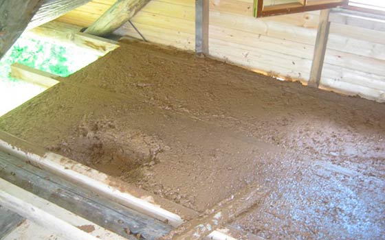 Изолацията на стени или тавани се извършва приблизително по същия начин. Първо се извършва подготвителна работа, повърхността се подготвя за нанасяне на изолация. След това продължете директно към запълване на рамката с глинен разтвор.