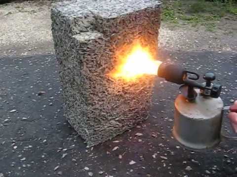 | Въпреки съдържанието на дървени стърготини, блокът от дървени стърготини не изгаря, поради наличието на циментово свързващо вещество в състава. |