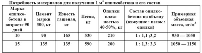 Може да се използва бетонобъркачка. За да се приготви готов разтвор, суровините могат да се дозират чрез претегляне, но е по-удобно да се направи съставът на бетон от дървени стърготини с прости средства, пропорциите на обема в кофи по марки могат да се видят от следната таблица: