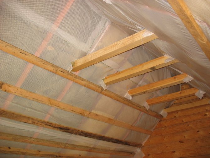 - За да се предотврати проникването на влага, която се образува върху изолацията, в дървото, стените са покрити с хидроизолационен филм. Разстила се по цялата повърхност и се фиксира с телбод с метални скоби. Всеки ръб трябва да премине над предишния с 15-20 см и да бъде фиксиран с лента.