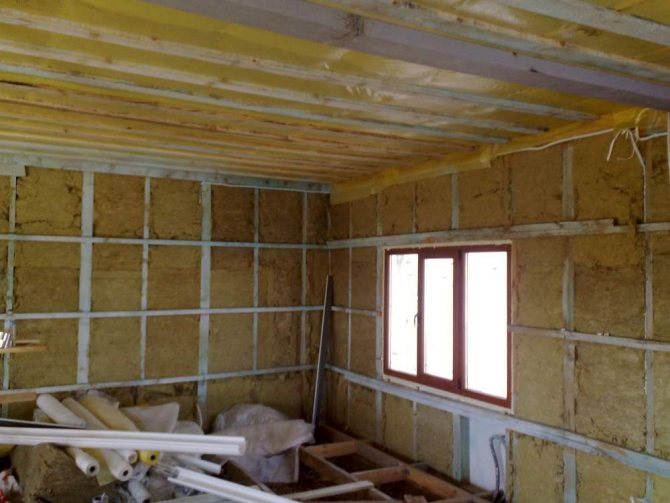- След монтирането на рамката се полага изолацията. Той е подрязан до височината на стената, ширината трябва да е малко по-широка от разстоянието между дървените блокове.