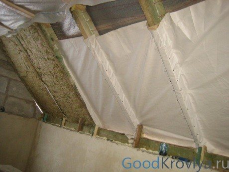 - Както бе споменато по-горе, когато се използва каквато и да е органична изолация, се изисква хидроизолационен слой. В този случай най-рационалното решение е влагоустойчивата мембрана. Той не само осигурява защита срещу конденз, но също така позволява на стените да останат "дишащи".