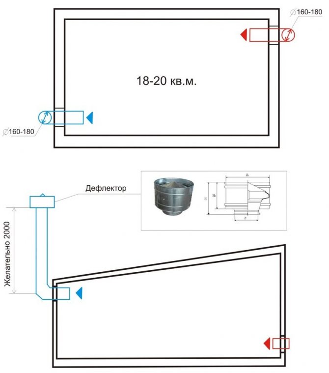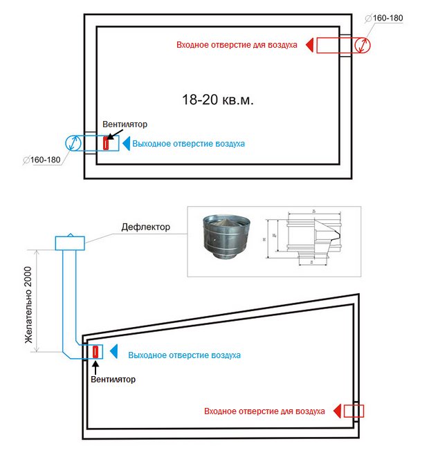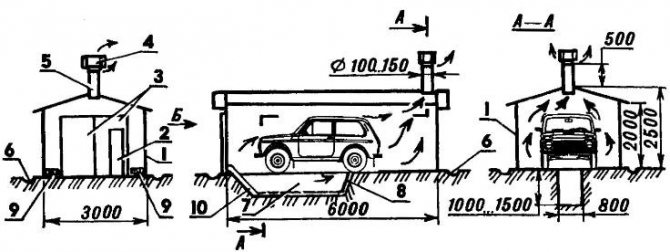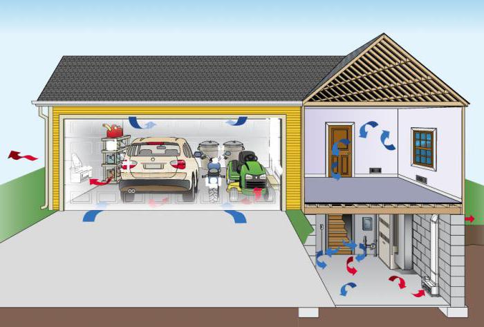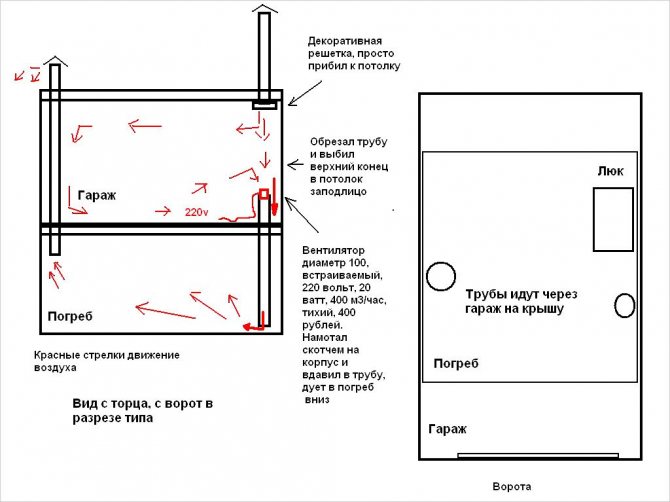 Трябва да се отбележи, че схемата е предназначена за гараж с височина най-малко 3 м. Тъй като входящите и изходящите отвори трябва да бъдат на разстояние 2,5–3 m.