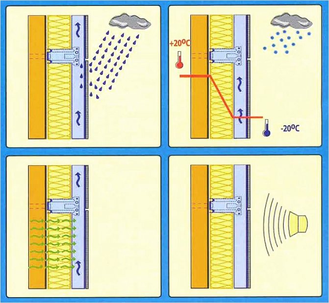 От дадената информация следва известно логическо противоречие. Но има напълно разбираемо и просто решение: за да се осигури оптимална хидроизолация и паропропускливост, защитното фасадно покритие трябва да бъде фиксирано на определено разстояние от повърхността на стената, като същевременно се осигурява висококачествена вентилация на процепа. Именно тази конструкция обикновено се нарича вентилирана фасада.