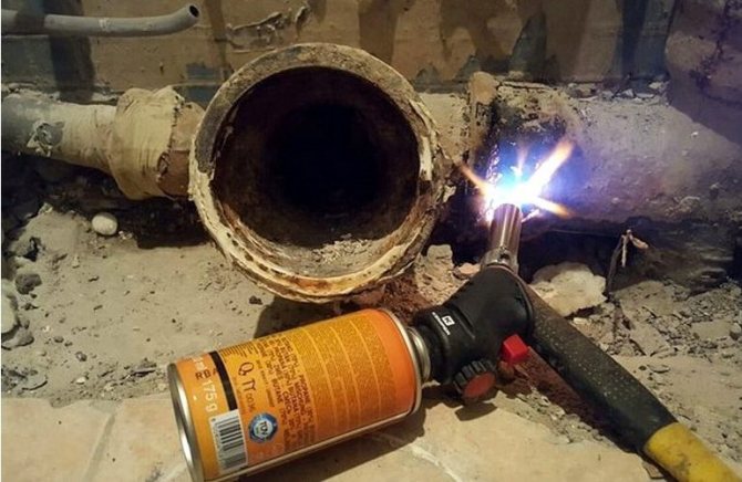 • необходимо е внимателно да се загрее гнездовата част на чугунената тръба в кръг с помощта на духалка или газова горелка, като не забравяйте да продължите да разхлабвате, усуквате и потупвате гнездовата част на тръбата;