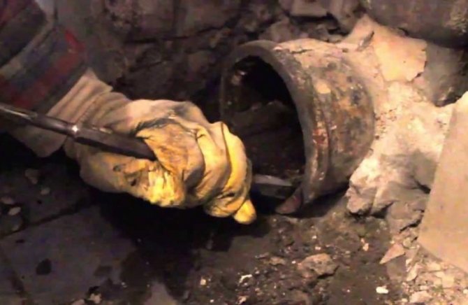 За да започнете да демонтирате, трябва да отрежете част от тръбата. В този случай си струва да се отдръпнете най-малко 30 см от кръстовището. Замръзналият цимент се отстранява с чук, който трябва да бъде ударен върху отвертка или длето, поставено в отвора. Всички процедури трябва да се извършват възможно най-внимателно, за да не се повреди гнездото.