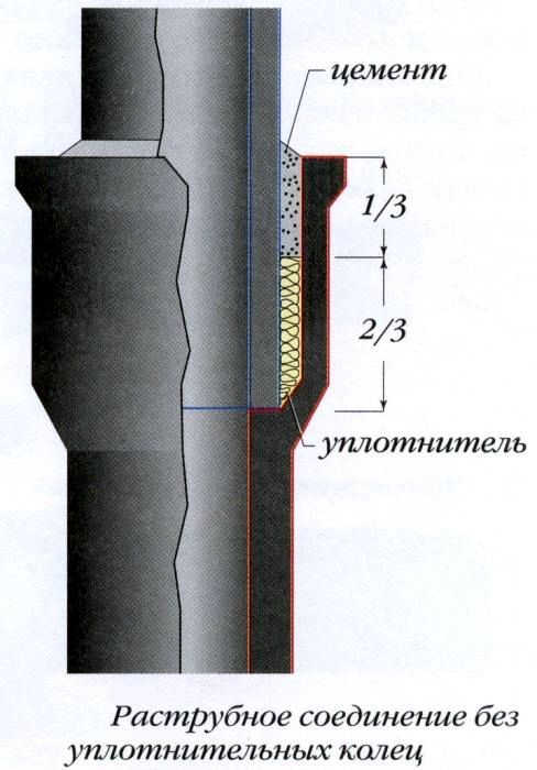 Запечатването на гнездата от чугунени тръби със смола и цимент изисква много труд, значителна консумация на нишки и дълго време, за да се втвърди циментът. Освен това херметичността на фугите зависи от качеството на уплътняване и преследване. Първо се избират необходимите тръби и фитинги. След това се нарязват на ръчна преса или на задвижвана машина, получават се части с необходимия размер и се регулират тръби и фитинги. След това почистете фугите от прах и мръсотия с твърда четка и изплакнете с вода.След изваждането на частта от ваната, инвентарните клинове се избиват от фугите с леки удари с чук и дупките от тях се запечатват с разтвор на разширяващ се цимент. Подготвените тръбопроводи могат да бъдат изпратени до местата за монтаж не по-рано от 16 часа след уплътняването на фугите.