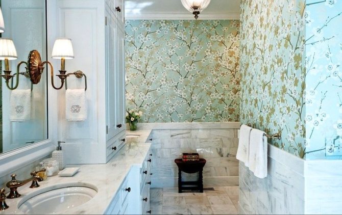 Не се изненадвайте, но за довършване на банята можете да вземете тапет, в комбинация с панели или плочки, като ги поставите отгоре. Устойчиви на влага фибростъкло (маркирането е подчертано) или винил ще свършат работа.