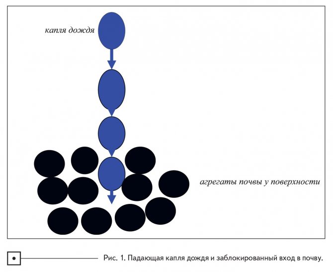 Трябва да се опитаме да гарантираме, че водата, съдържаща се в дъждовната капка, веднага попада в пролуките между почвените агрегати и се задържа там за по-нататъшно използване от културата. Първо, нека си представим улавянето на валежите по отношение на дъждовна капка, която удря повърхността на почвата и прониква дълбоко в земята (Фигура 1). Имайте предвид, че колкото по-дълго са отворени пролуките между почвените агрегати, толкова по-малко вода се пречи и по-бързо се абсорбира, поради което натрупването на валежи ще бъде отлично.
