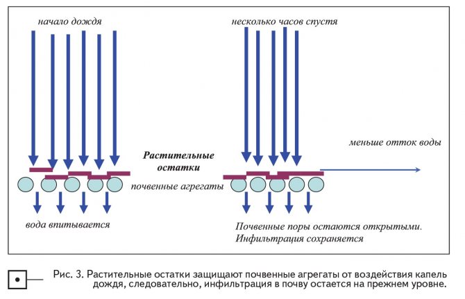 Задържането на вода може да се извърши на адекватно ниво, ако можем да поддържаме порите на почвената повърхност отворени. Следователно защитата на почвените агрегати от капки дъжд е ключът към поддържането на максимално улавяне на вода за дадена почвена ситуация (Фигура 3).
