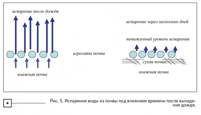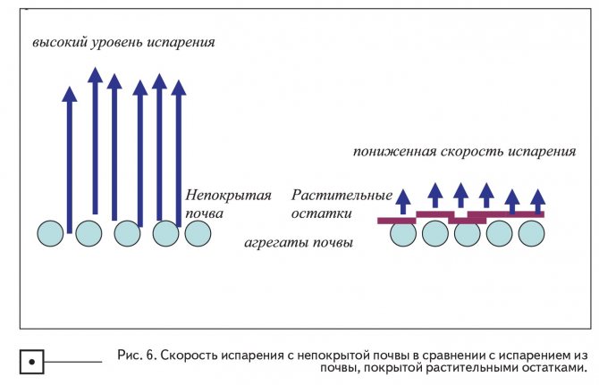 Нека да покажем как остатъците от растения, оставени на повърхността на почвата, влияят върху изпарението на водата от почвата. Очевидно те ще отразяват слънчевата енергия, охлаждайки повърхността на почвата, а също и вятъра; и двата ефекта ще намалят първоначалната скорост на изпаряване на водата (фиг. 6).