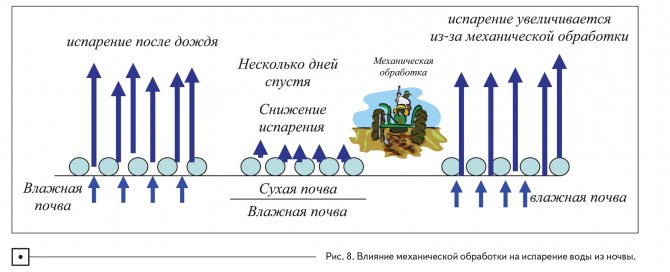 Когато почвата се обработва механично, влажната почва се отваря към повърхността. Това означава, че бързото изпаряване започва веднага след обработката (фиг. 8). Очевидно е, че ако се използва механична обработка за борба с плевелите, тя ще загуби влага, защото постоянно излага мократа почва на бързо изпаряване на повърхността. За разлика от това, no-till, който използва борба с плевелите, базирана на хербициди, не води до изпаряване, тъй като няма въздействие върху почвата. Почвата остава влажна на повърхността и следователно следващият дъжд няма да подмокри сухата почва, а ще проникне по-дълбоко в почвата и ще се натрупа за бъдеща употреба.