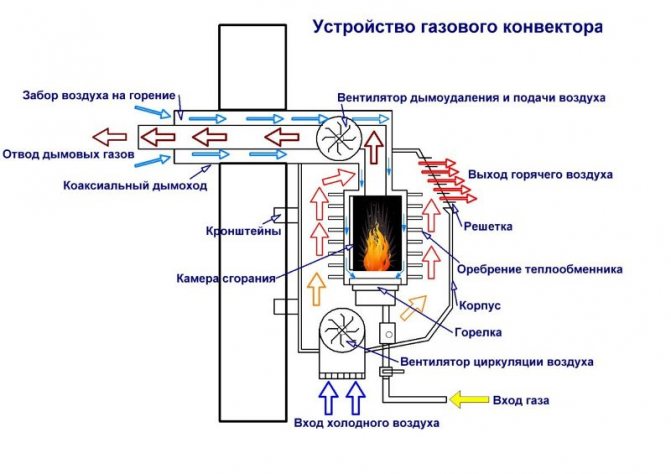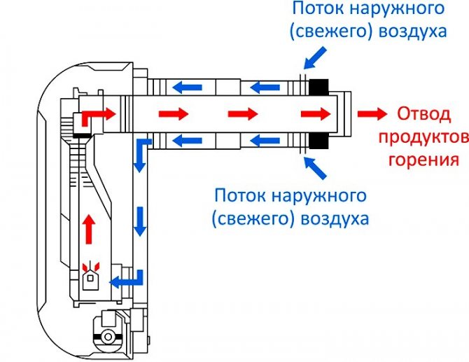 Газовата горелка се намира в долната част на топлообменника. Въздухът от улицата навлиза в зоната на горене през външната тръба, отработеният въздух с продуктите от горенето се извежда през вътрешната тръба. Тъй като въздушните потоци са разделени само от слой метал, въздухът, идващ от улицата, при движение се загрява. Следователно агрегатите със затворена горивна камера имат по-висока ефективност: по-малко топлина излиза в тръбата.