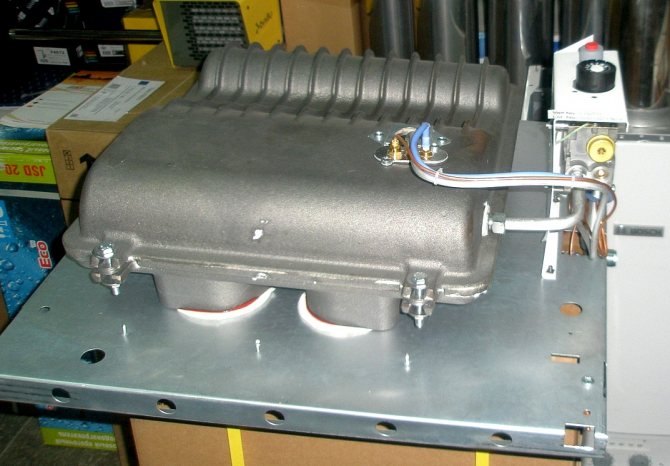 Ефективността на агрегата зависи от формата и материала на топлообменника. По правило топлообменниците са изработени от чугун или стомана. Чугунът е по-надежден, но е по-тежък и по-скъп.Ако стената има ограничение на носещата способност, теглото може да бъде критично. В други случаи е по-добре да закупите продукти с чугунени топлообменници. Но по време на работа е необходимо да се изключи проникването на вода върху горещата повърхност на чугуна - дори няколко капки чугун могат да се напукат.