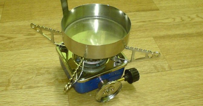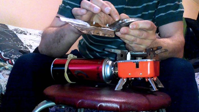 За да направите най-простия нагревател, ще ви трябва китайска евтина горелка (обикновено е почти невъзможно да кипнете чайник на такова устройство) и квадратна алуминиева консервна каша. Това може да се намери във всяка кухня. Вместо това можете да изберете консервна кутия с подходящ диаметър за горелката.