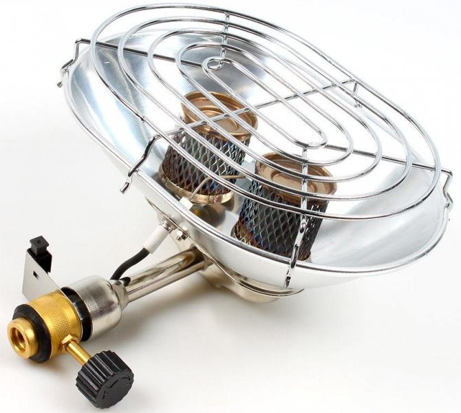 Вторият вариант е преносим нагревател за газова палатка, оборудван с метален радиатор. Поради факта, че металните пръти на работния елемент са скрити, тази опция също е напълно приемлива за използване при поход. Дизайнът му е безопасен, а специален рефлектор, разположен в задната част на корпуса, ви позволява да регулирате посоката на топлинния поток.