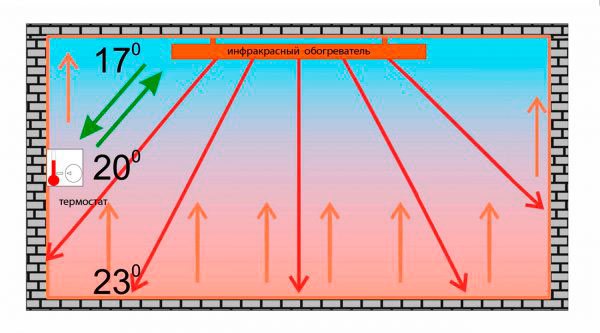 Отоплението на работните зони на производството с инфрачервени нагреватели е по-евтино от стандартното отопление с помощта на радиаторна система. Топлината в стаята се усеща веднага след включване на оборудването. Инфрачервеното лъчение въздейства върху повърхността на предметите, като ги загрява. Останалата топлина се пренася във въздуха чрез естествен въздушен обмен. Методът на работа на нагревателя донякъде напомня нагряването на земята и ефекта на естествен топлоносител - Слънцето. През зимата, под преките слънчеви лъчи, човек е горещ навън, дори и със слана. Това се дължи на излагане на ултравиолетова радиация. Подобен метод се основава на IR отоплителни системи.