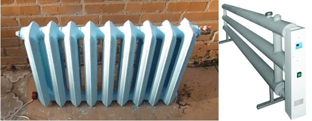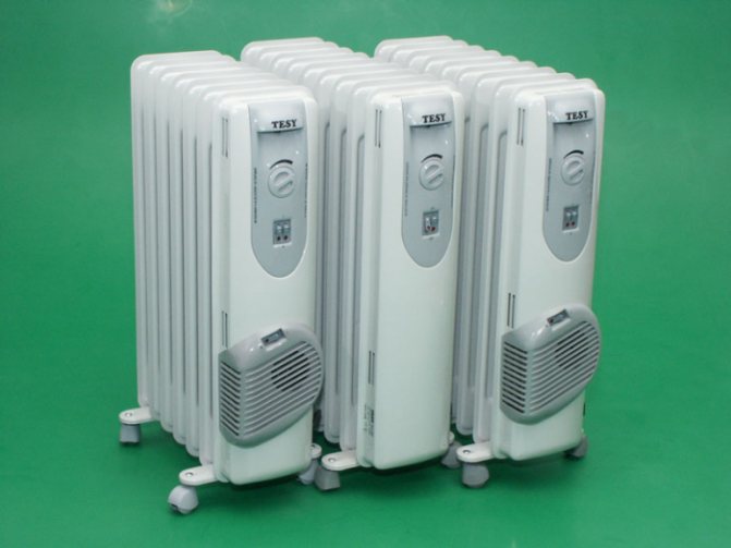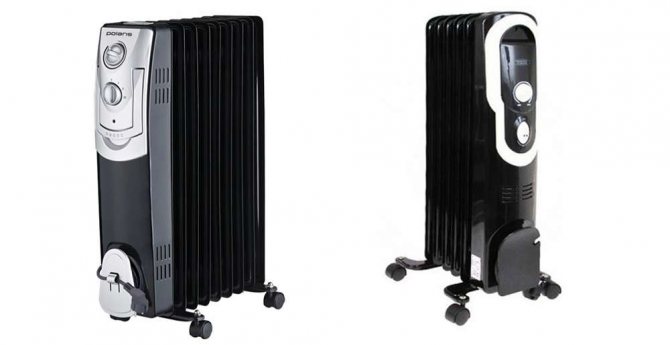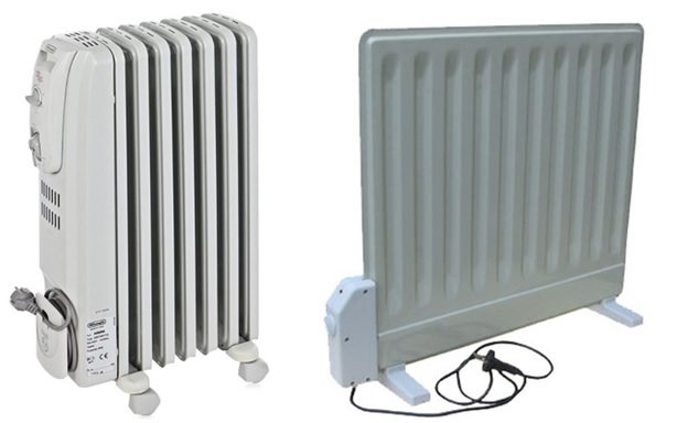 Маслени електрически нагреватели от промишлено производство: отляво - оребрени, отдясно - плоски.