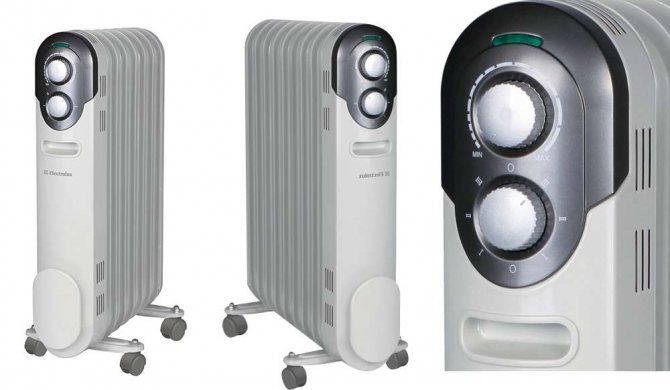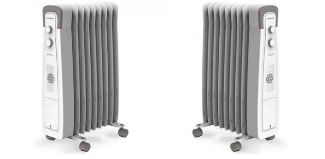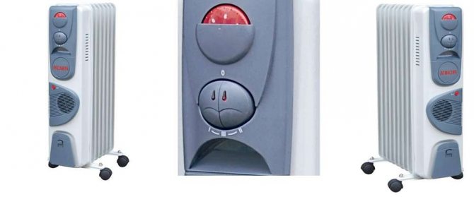 Дизайнът на масления охладител е съвсем прост. Състои се от тяло, напълнено с масло и един или повече нагревателни елементи. Нагревателят се управлява от съществуващия регулатор. Тя ви позволява не само да включите или изключите устройството, но и да регулирате интензивността на работа. Съвременните модели маслени нагреватели могат допълнително да бъдат оборудвани с: