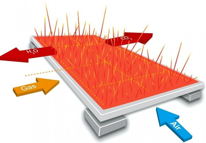 Разходът на гориво се извършва по безпламен начин. И това елиминира образуването на продукти от горенето, което прави устройството екологично и безопасно. По отношение на ефективността нагревателят заобикаля стандартната газова горелка.