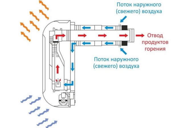 Всъщност това е коаксиална тръба, състояща се от две тръби, едната от които е разположена вътре в другата. Външната тръба действа като конвектор и защитно покритие, което абсорбира инфрачервеното лъчение. Вътрешната част на конструкцията служи за отстраняване на отработените газове и продуктите от горенето, докато външната е предназначена за подаване на чист въздух за поддържане на горивния процес в горивната камера.
