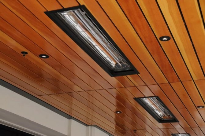 - Таванни инфрачервени нагреватели, които са стационарни устройства. Те се предлагат под формата на панели, филми или лампи, подобни на външен вид на флуоресцентните.Тези устройства могат значително да спестят място, те затоплят доста голяма площ от стаята добре. Като се има предвид трудният достъп до тях, устройствата са оборудвани с термостати и дистанционни управления.