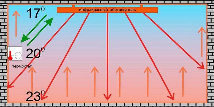Действието на инфрачервения нагревател се основава на факта, че инфрачервените лъчи засягат мебелите, както и някои строителни елементи в границите на радиацията. При подаване на напрежение към инфрачервеното устройство нагревателят започва да излъчва лъчи в инфрачервения диапазон, които по никакъв начин не въздействат на въздуха, а се "утаяват" върху обекти в обсега.