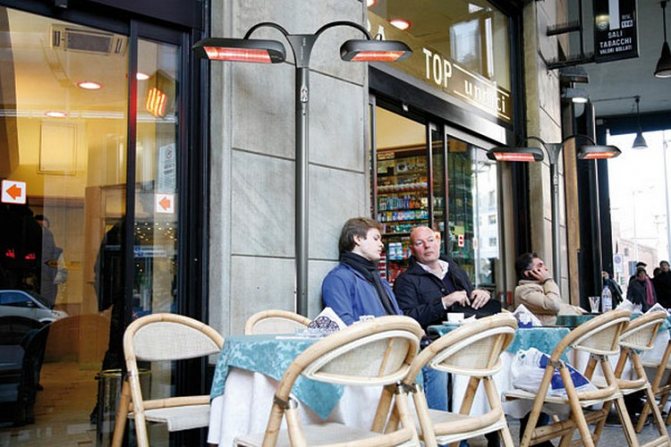 - Преносими инфрачервени отоплителни устройства на открито. Те могат да се носят навсякъде в стаята или дома. За разлика от предишните видове, подовите нагреватели заемат допълнително подово пространство. Изработени под формата на лампи или панели, те се окомплектоват със специални стойки под формата на стативи или крачета на стойката за стабилно положение. Почти всички подови уреди имат вградени сензори за аварийно изключване в случай на преобръщане. Но не всички подови модели са оборудвани с термостати.
