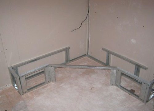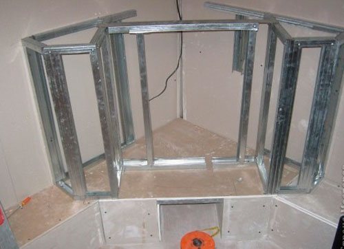 Стъпка номер 2. Създаване на структура за подиума. За това се използва метален профил. Трябва да ги фиксирате към стената и един към друг с помощта на самонарезни винтове. И тогава подиумът е обвит с гипсокартон. Разстоянието между винтовете трябва да бъде не повече от двеста милиметра.