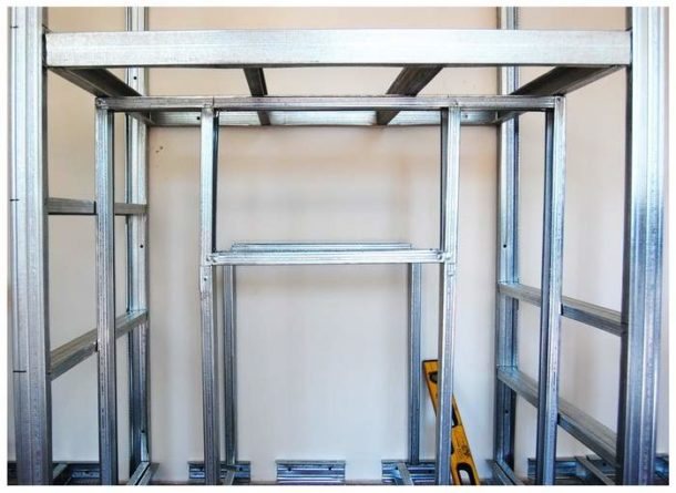 - Основата на задната равнина на нишата, състояща се от два вертикални стълба и две хоризонтални напречни греди, е прикрепена към стената с помощта на дюбели. Те са направени от направляващ профил. Височината на долната напречна греда е равна на издигането на подиума, върху който ще бъде разположена камината.