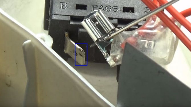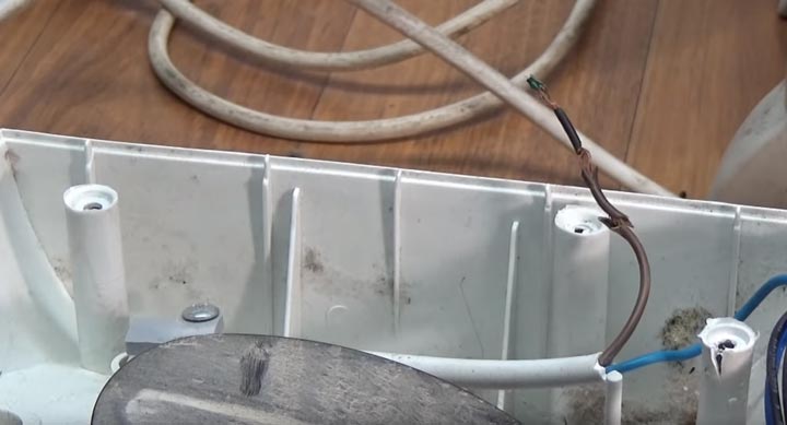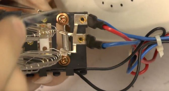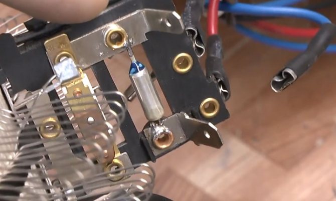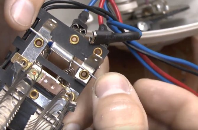 На обратната страна на тази двойна защита, на противоположните контакти на нагревателния елемент, окабеляването от превключвателя за режим е подходящо.