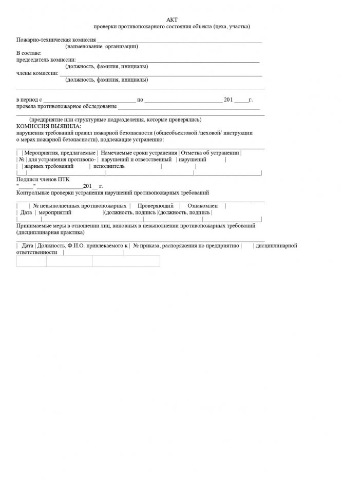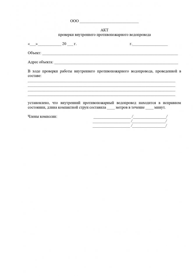 Актът установява наличието или липсата на дефекти и неизправности в системата за пожарогасене на водоснабдяване. Проверката се извършва от отговорни служители на предприятието. Честота - поне два пъти годишно, за запалими индустрии, инспекциите могат да бъдат насрочени по-често.