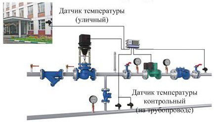 По този начин при големи обекти контрол на стайната температура може да се извършва само с помощта на устройства, които променят дебита на охлаждащата течност в отоплителната мрежа и я поддържат на дадено ниво, така че да не излиза извън температурния график.