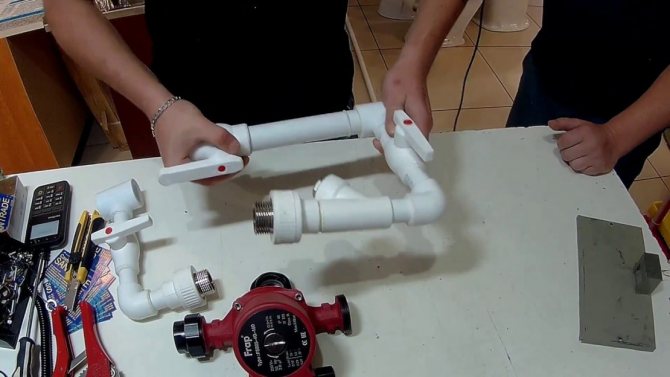 Преди да започнете работа, трябва да вземете решение за материала на водоснабдителната система.За полипропиленови тръби се използват сгъваеми съединения и първо помпеният агрегат се сглобява заедно с байпаса. Клонът е свързан с помощта на тройници, монтирани в основната тръба. В случай на стоманена версия, тръбите първо се запояват, а след това клапанът на байпаса. Байпасната система е инсталирана по посока на охлаждащата течност и трябва да бъде сглобена в определена последователност.
