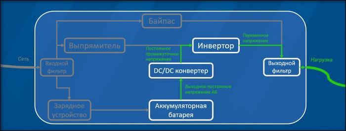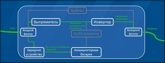 В многокомпонентната схема на тези устройства се прилага принципът на двойна инверсия. Обслужвано котелно оборудване, независимо от състоянието на мрежата, винаги захранва се от батерия.