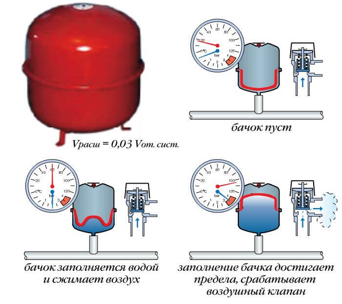 Разширителният резервоар трябва да бъде инсталиран в горната част на системата: той ще изпълнява функцията за получаване на пара и излишна топлина - това е необходимо поради свойството на водата да се разширява при нагряване и да премине в състояние на пара. Резервоарът трябва да има дренажен кран и капачка или клапан отгоре. След нагряване на водата тя се разпределя през захранващата тръба към щранговете и радиаторите.