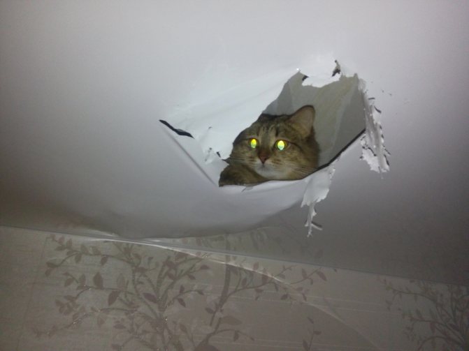 Платът има още едно предимство - не се страхува от горещо време. И напрежението на еластичния филм отслабва при нагряване, дори може да се появи увисване. Разбира се, когато таванът се охлади, той възвръща първоначалния си вид, но в същото време възникват допълнителни експлоатационни натоварвания, които оказват влияние върху експлоатационния живот на покритието. Разбира се, няма смисъл постоянно да включвате климатика в празна селска къща, както и да го отоплявате през зимата. В допълнение, крайградска сграда в студа може да се превърне в убежище за мишки, а PVC филмът - обект на тяхното голямо внимание.