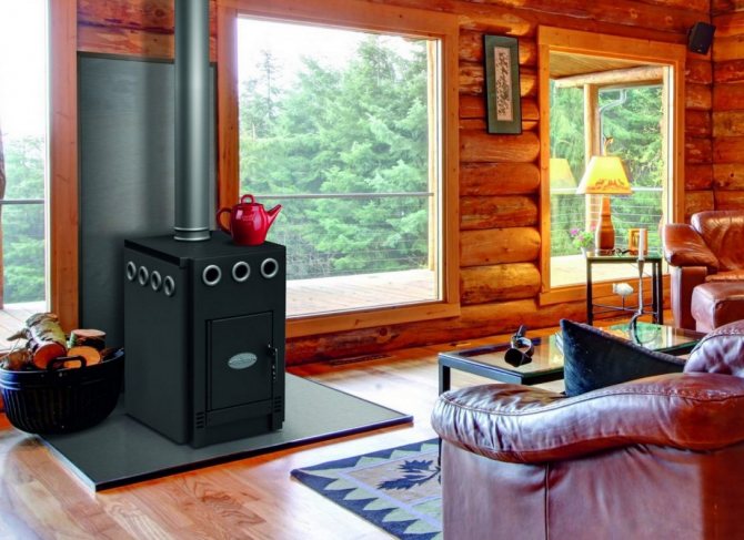 Удобно е да използвате единици с продължително изгаряне. Една отметка на дърва за огрев е достатъчна за цялата нощ, отделените пиролизни газове не излизат в комина, а се изгарят във втората камера. Освен това можете да инсталирате котлон и да готвите храна във фурната. Оборудването се намира навсякъде в стаята, тъй като не изисква предварителна подготовка на основата.