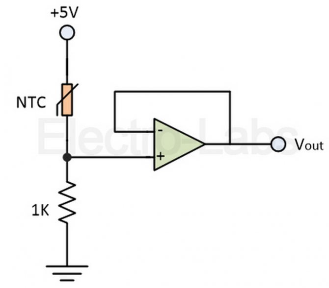 Пример: Помислете за термистор със стойност на съпротивление 2.2K при 25 ° C и 50 ома при 80 ° C. Термисторът е свързан последователно с резистор 1 kΩ чрез 5 V захранване.