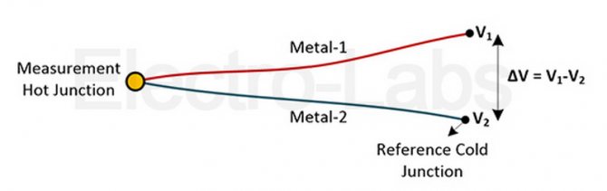 Ако и двете съединения са с една и съща температура, потенциалът за разлика в различните съединения е нула, т.е. V1 = V2. Ако обаче кръстовищата са с различни температури, изходното напрежение спрямо температурната разлика между двата кръстовища ще бъде равно на тяхната разлика V1 - V2.