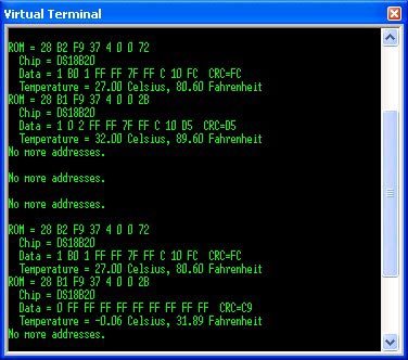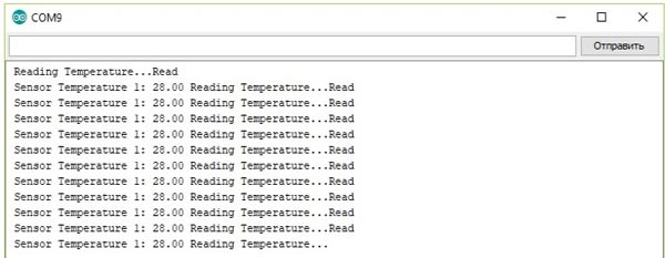 Авторът също така тества кода от [7], всичко работи веднага, в монитора на серийния порт можете да прочетете информация за вида на свързания сензор и действителните данни за температурата.