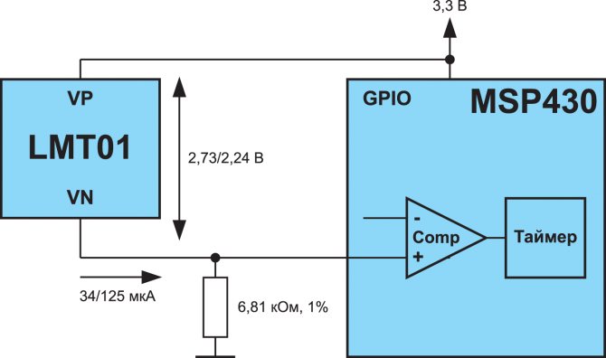 За съжаление, използването на един външен резистор не винаги е възможно поради ограничението на минималния спад на напрежението в сензора LMT01. По време на цикъла на измерване спадът на сензора трябва да бъде най-малко 2,15 V. По време на цикъла на предаване на данни спадът на напрежението може да бъде намален до 2 V. Не е трудно да се направят груби изчисления.