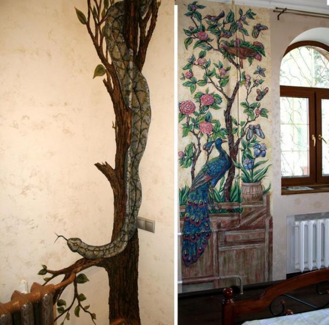 Не е нужно да сте велик художник, за да трансформирате щранг в ствол от бреза и да допълните картината с буйна зелена корона на съседна стена с помощта на шаблони. Не е необходимо да вземете бреза за основа, можете да "засадите" дъб в стаята или дори да се отдалечите от темата за дърветата и просто да украсите скучния "апендицит" с калинки, полка точки, имитация на камъни или замъглени шарки в авангарден стил.
